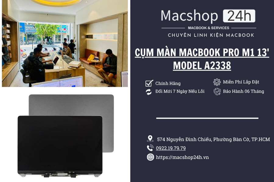 📣 Gọi ngay Macshop24h để thay cụm màn MacBook Pro M1 13″ (A2338) – Chính hãng tháo máy 99%, thay nhanh, bảo hành 06 tháng!