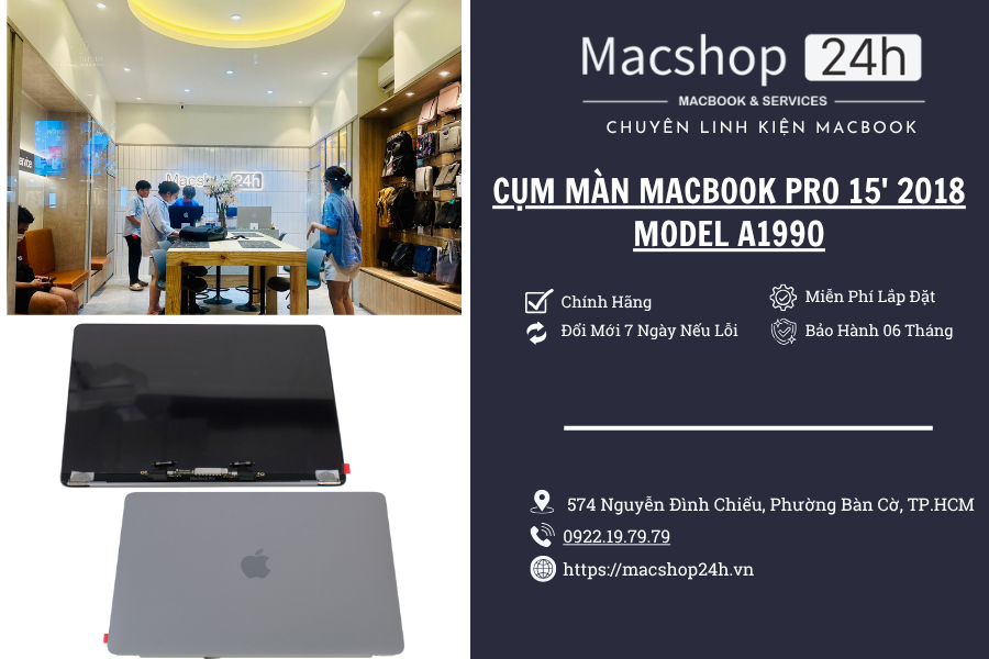 cụm màn macbook pro 15 2018, màn hình macbook pro a1990, thay màn macbook pro 15 inch, retina 2880x1800, macshop24h thay màn