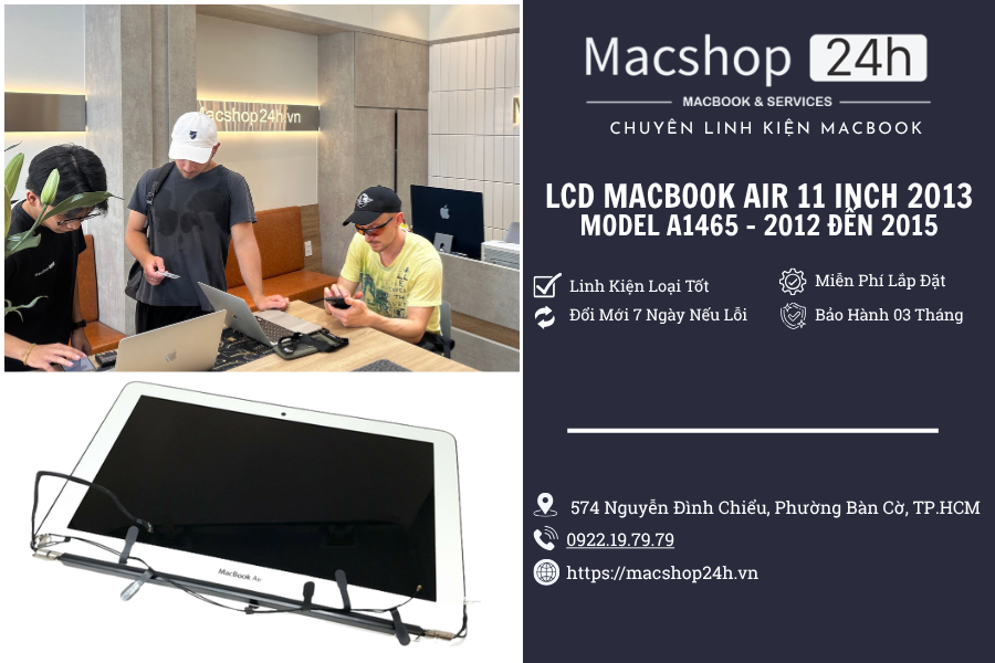 📣 Gọi ngay Macshop24h để thay LCD MacBook Air 11″ 2013 (A1465) nhanh chóng – Hiển thị rõ nét, bảo hành 3 tháng!