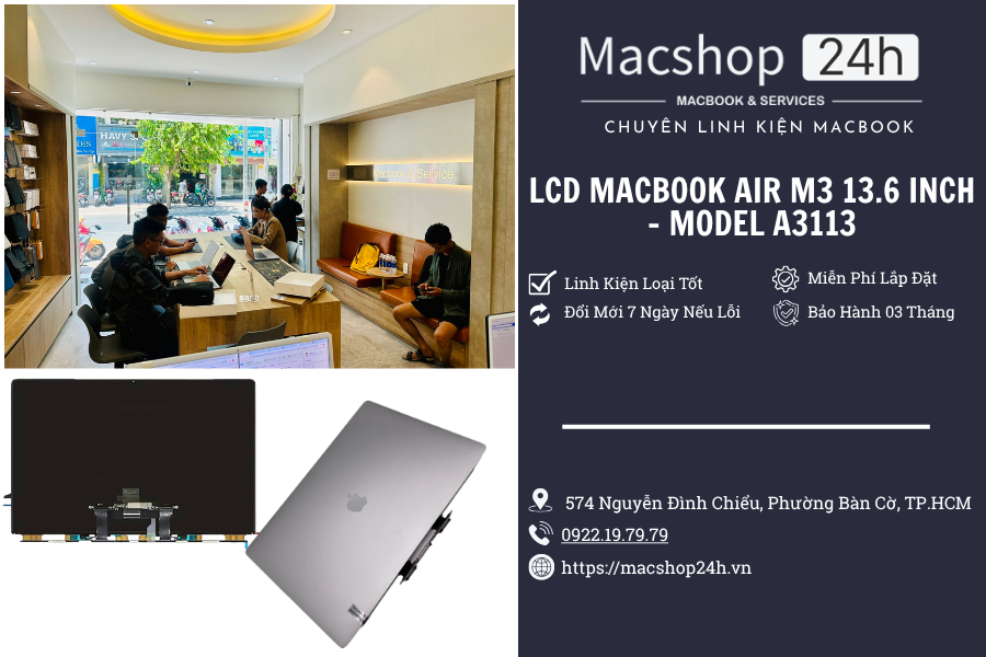 LCD MacBook Air M3 13.6 inch – Model A3113 là màn hình thay thế chất lượng cao, chuẩn Retina, dành riêng cho MacBook Air đời 2024. Linh kiện mới 100%, thay tại chỗ trong 3-4 tiếng, miễn phí vệ sinh và lắp đặt tại Macshop24h.
