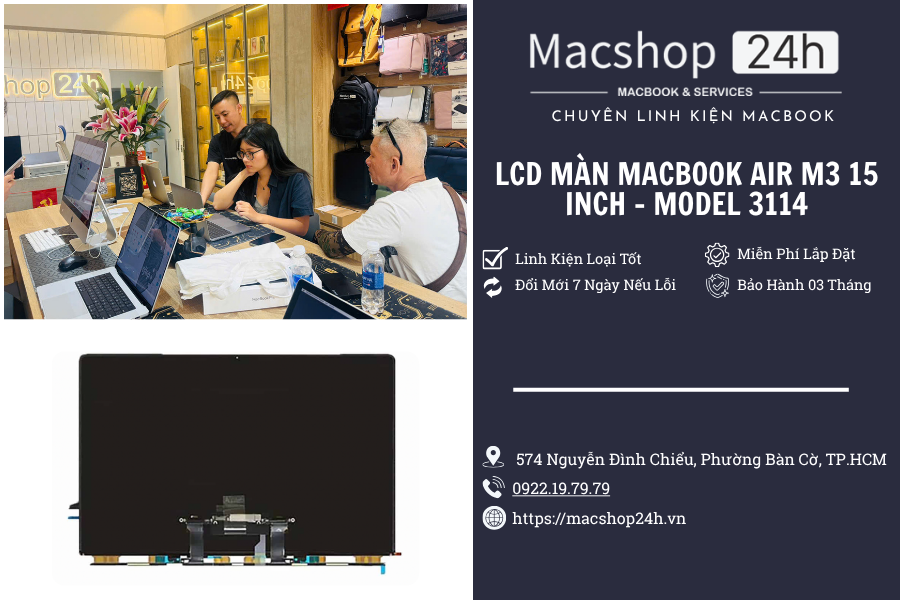 LCD MacBook Air M3 15 inch – Model A3114 là màn hình thay thế cao cấp, chuẩn Retina, tương thích tuyệt đối với MacBook Air đời 2024. Sản phẩm được Macshop24h cung cấp với hình ảnh thật 100%, bảo hành rõ ràng và thay thế trong 30 phút.