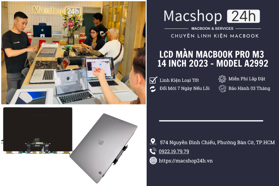 thay màn hình macbook pro m3 14 inch, lcd macbook m3 a2992, thay lcd macbook pro 2023, thay màn hình macbook liquid retina xdr, sửa macbook pro bị đốm sáng, macbook pro m3 bị sọc, thay lcd macbook m3 lấy liền
